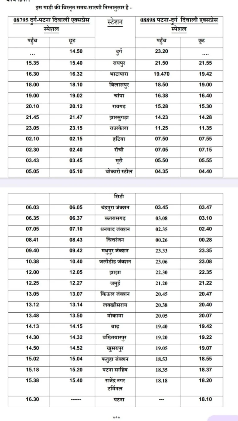 रायपुर। दिवाली के अवसर पर दुर्ग एवं पटना के मध्य रेल यात्रियो की सुविधा को ध्यान में रखते हुए रेलवे प्रशासन के द्वारा दो फेरे के लिए दिवाली स्पेशल गाड़ी 08795/ 08796 दुर्ग-पटना-दुर्ग के मध्य एक फेरे के लिये चलाई जायेगी । यह गाड़ी गोंदिया से 08795 नंम्बर के साथ दिनांक 19 अक्टूबर, 2025 को तथा पटना से 08796 नम्बर के साथ दिनांक 20 अक्टूबर, 2025 को चलेगी ।